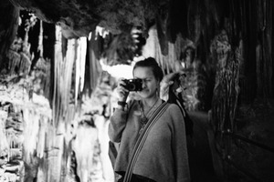 A young woman stands at the heart of a cavern, confidently holding a camera, her expression playful yet introspective. The dim lighting and shadows emphasize the intricate stalactites that envelop her, creating a mysterious atmosphere. The stark contrasts in the black-and-white composition invite the viewer to focus on her connection with the natural wonder around her.