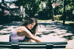 A young woman sits pensively on a bench, her posture relaxed yet introspective, surrounded by the dappled light of a sunlit basketball court. The play of shadows and sunlight enhances the soft textures of her hair and skin, creating a serene and contemplative mood. The green bench contrasts with the warm tones of the environment, inviting viewers into a tranquil moment amidst a lively setting.