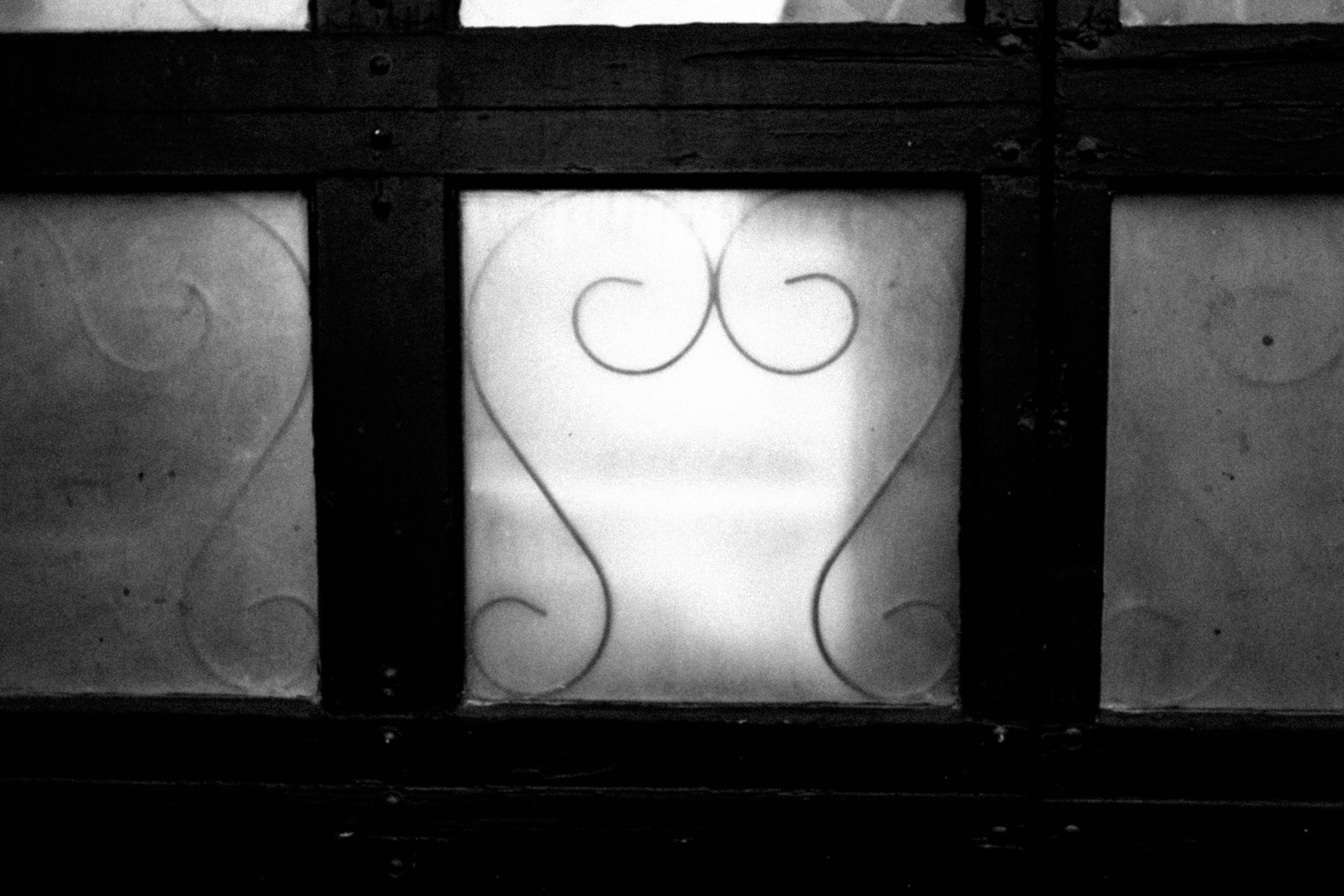 This photograph captures an intricately designed windowpane, where soft light filters through frosted glass, creating a sense of mystery and allure. The dark wooden frame contrasts with the delicate curves of the ironwork, evoking a mood of nostalgia and contemplation. The monochrome palette enhances the interplay of shadow and light, inviting viewers to ponder what lies beyond.