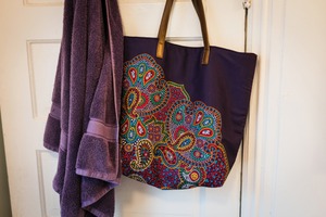 A vibrant, intricately patterned tote bag hangs beside a plush purple towel, creating a cozy, inviting atmosphere. The soft, natural lighting highlights the rich colors and textures, establishing a sense of warmth and comfort. The composition captures a glimpse of daily life, blending artistry with everyday utility.