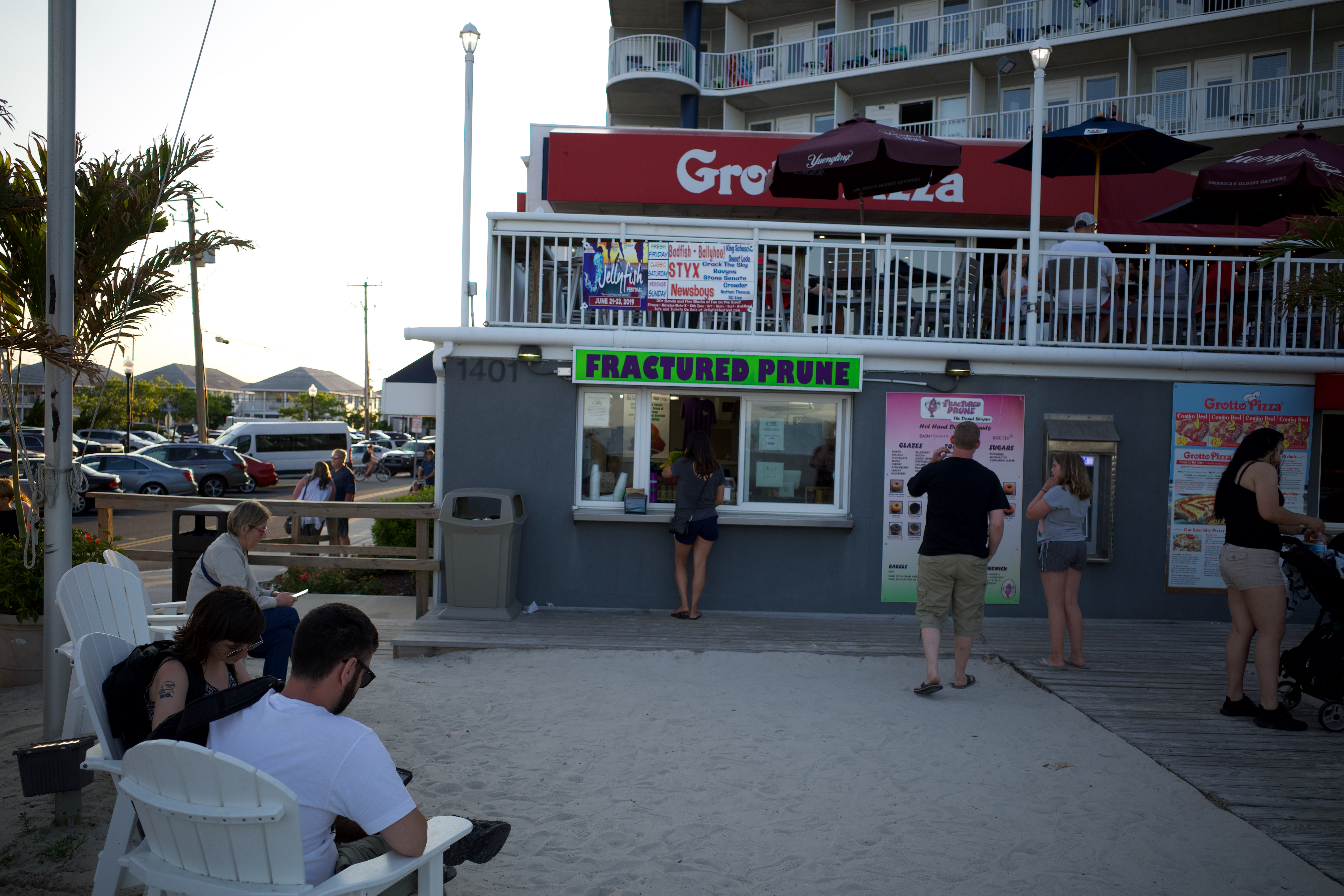The photograph captures a lively beach scene just before sunset, featuring a vibrant snack stand named 'Fractured Prune.' Patrons line up to order, while a few relaxed souls occupy white adirondack chairs on the sandy beach. The warm, fading light creates a welcoming atmosphere, reflecting the casual, enjoyable mood of a summer evening.