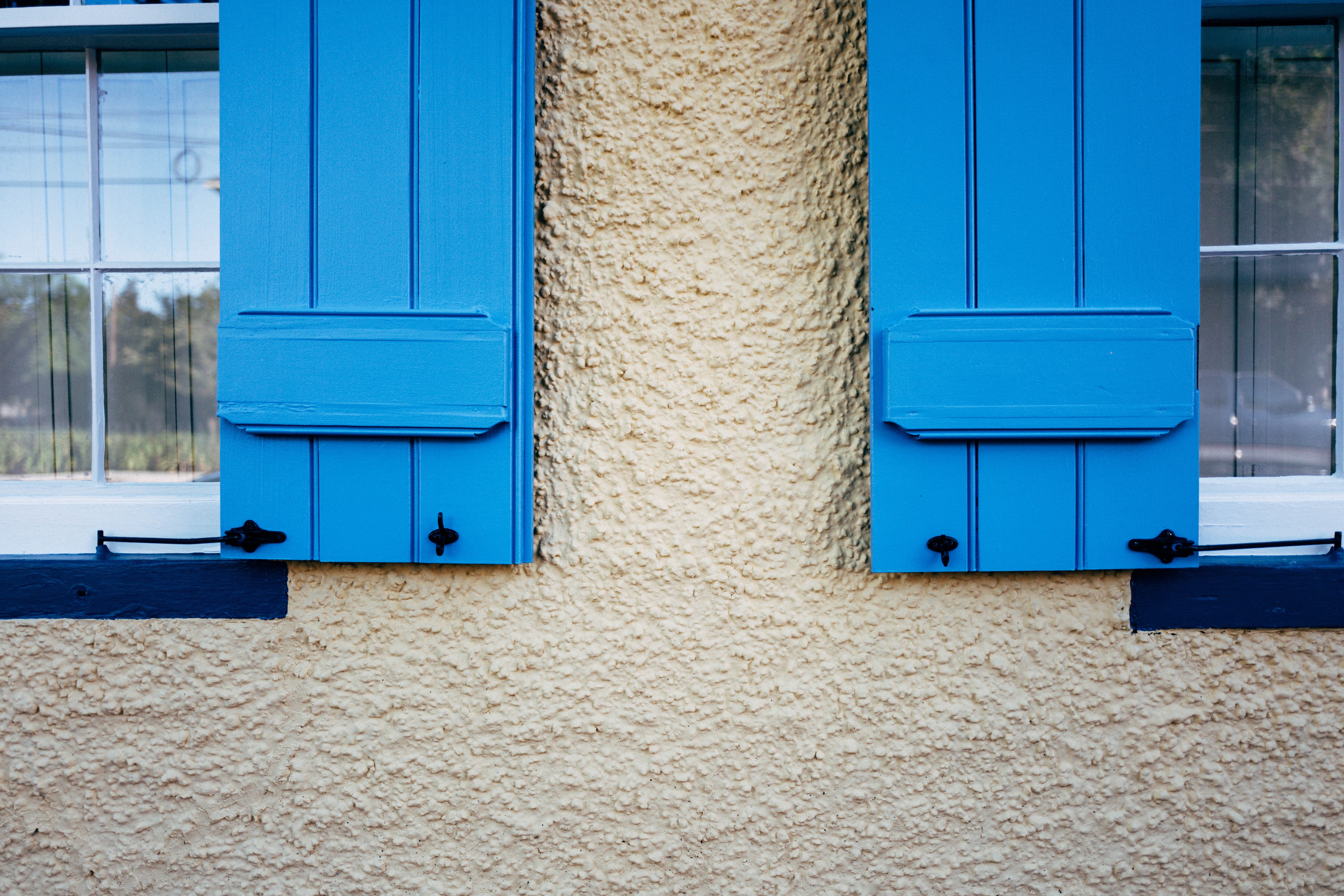 This photograph captures a striking composition of bright blue shutters against a textured, golden yellow wall. The use of color evokes a vibrant, welcoming mood, while the careful alignment of the shutters and window creates a sense of symmetry and balance. Soft, natural light enhances the colors, adding depth and inviting the viewer's gaze.
