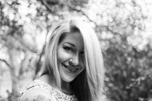 In this intimate black-and-white portrait, a young woman flashes a playful smile, her confident expression drawing the viewer in. Soft, muted lighting casts gentle shadows, enhancing her features while the blurred background of foliage suggests a serene, natural setting. The composition focuses on her vibrant personality, creating a mood that feels both candid and inviting.