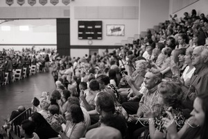 In a packed gymnasium, a diverse crowd gathers in hushed excitement, their faces lit by the soft glow of ambient light. The composition emphasizes the sea of spectators, each absorbed in anticipation of a significant event, creating a mood of celebration and connection. The black-and-white format adds a timeless quality to the moment, highlighting expressions of pride and joy amongst the attendees.