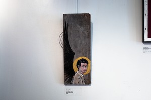 This artwork features a haunting portrait of a young man adorned with angelic wings, set against the textured backdrop of weathered wood. The contrast of the warm halo and the dark wings evokes a complex mood, oscillating between melancholy and hope. Soft, ambient lighting accentuates the vibrant colors of the painting, drawing the viewer into a moment of introspection.