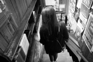 A solitary figure descends a dimly lit staircase, her long hair cascading down her back. The composition emphasizes the textured wood of the stairwell and the surrounding posters, creating an intimate, almost nostalgic atmosphere. The monochromatic tones enhance the mood, evoking a sense of mystery and quiet contemplation.