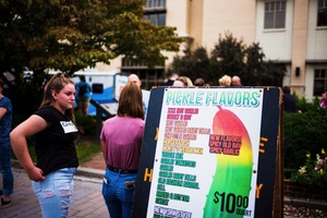 A lively scene unfolds as two young women examine a colorful pickle flavors sign, their expressions suggesting curiosity and anticipation. The vibrant colors of the menu contrast with the muted tones of the crowd in the background, creating a playful yet relaxed atmosphere. The soft, natural light enhances the inviting mood, drawing attention to the whimsical offerings of the food festival.