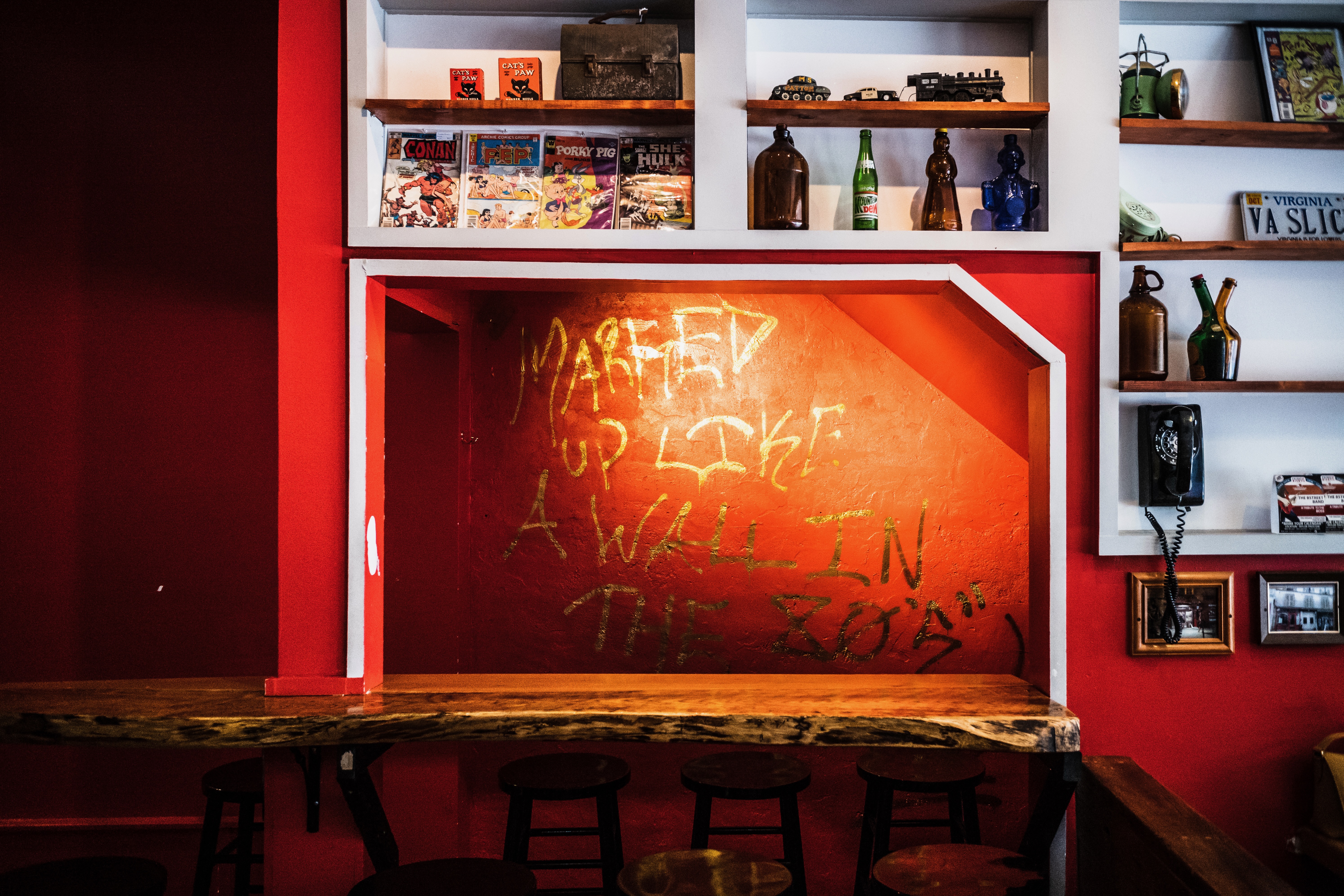 The photograph captures a vibrant corner of a bar, highlighting a striking red wall adorned with graffiti that reads, "Marred up like a wall in the '80s." The eclectic items on the shelves contribute to a playful and nostalgic ambiance, while the warm lighting creates an inviting mood, perfect for relaxed conversations. The composition draws the eye to both the text and the artifacts, evoking memories of a bygone era.