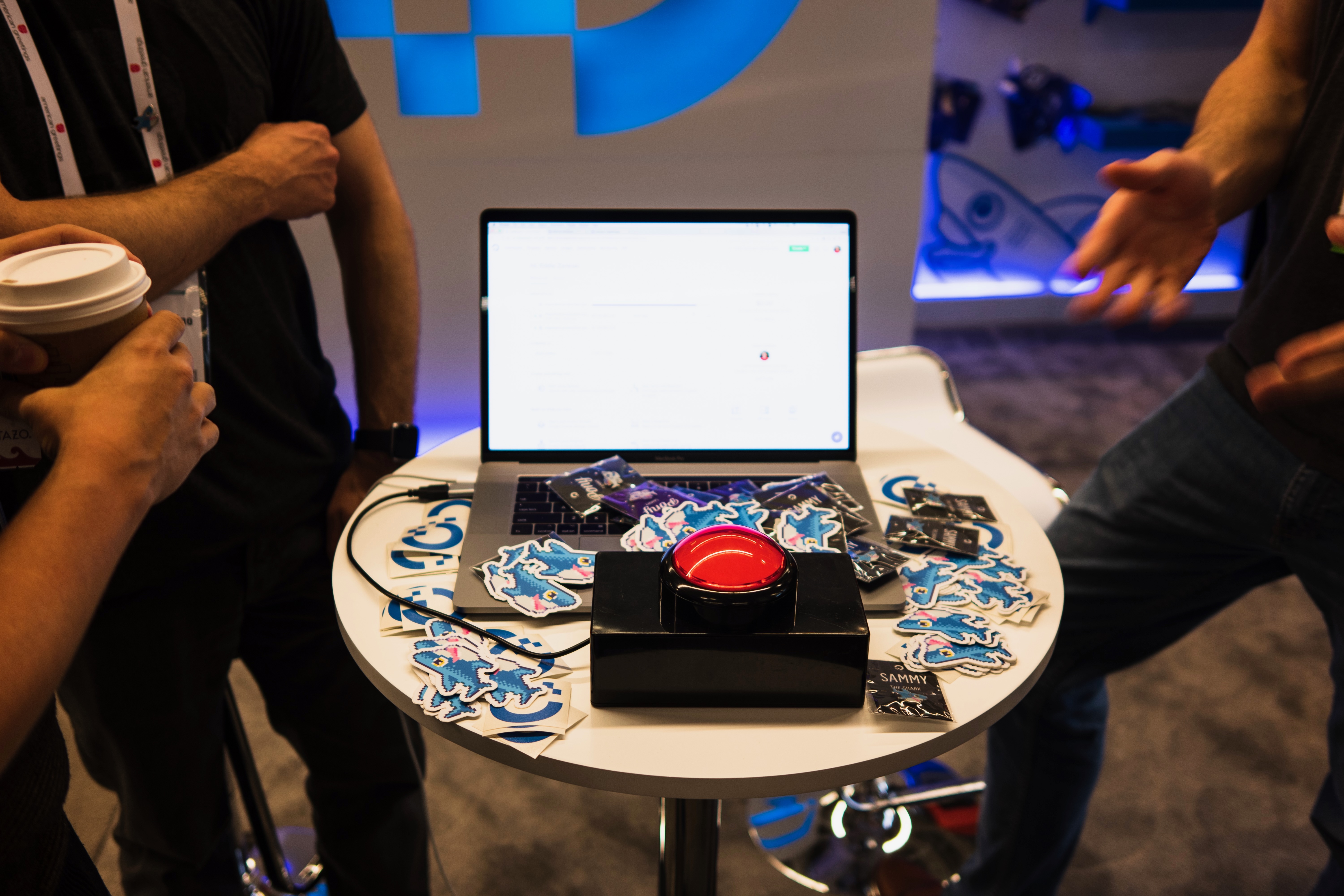 In a vibrant expo setting, a central large red button draws attention, surrounded by colorful stickers and gadgets. The soft, even lighting enhances the interactive atmosphere, while hands gesturing animatedly suggest an engaging discussion among attendees. The composition captures a moment of curiosity and excitement, with the laptop serving as a hub of technology and conversation.
