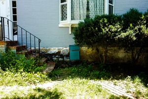 This photograph captures a quaint exterior view of a home, showcasing a mix of nature and architecture. The vibrant greens of the overgrown grass and shrubs contrast with the muted gray walls, while the warm sunlight bathes the scene in a gentle glow, evoking a sense of nostalgia and tranquility. A lone turquoise chair beside the shrub hints at forgotten conversations, inviting the viewer to imagine the stories of this space.