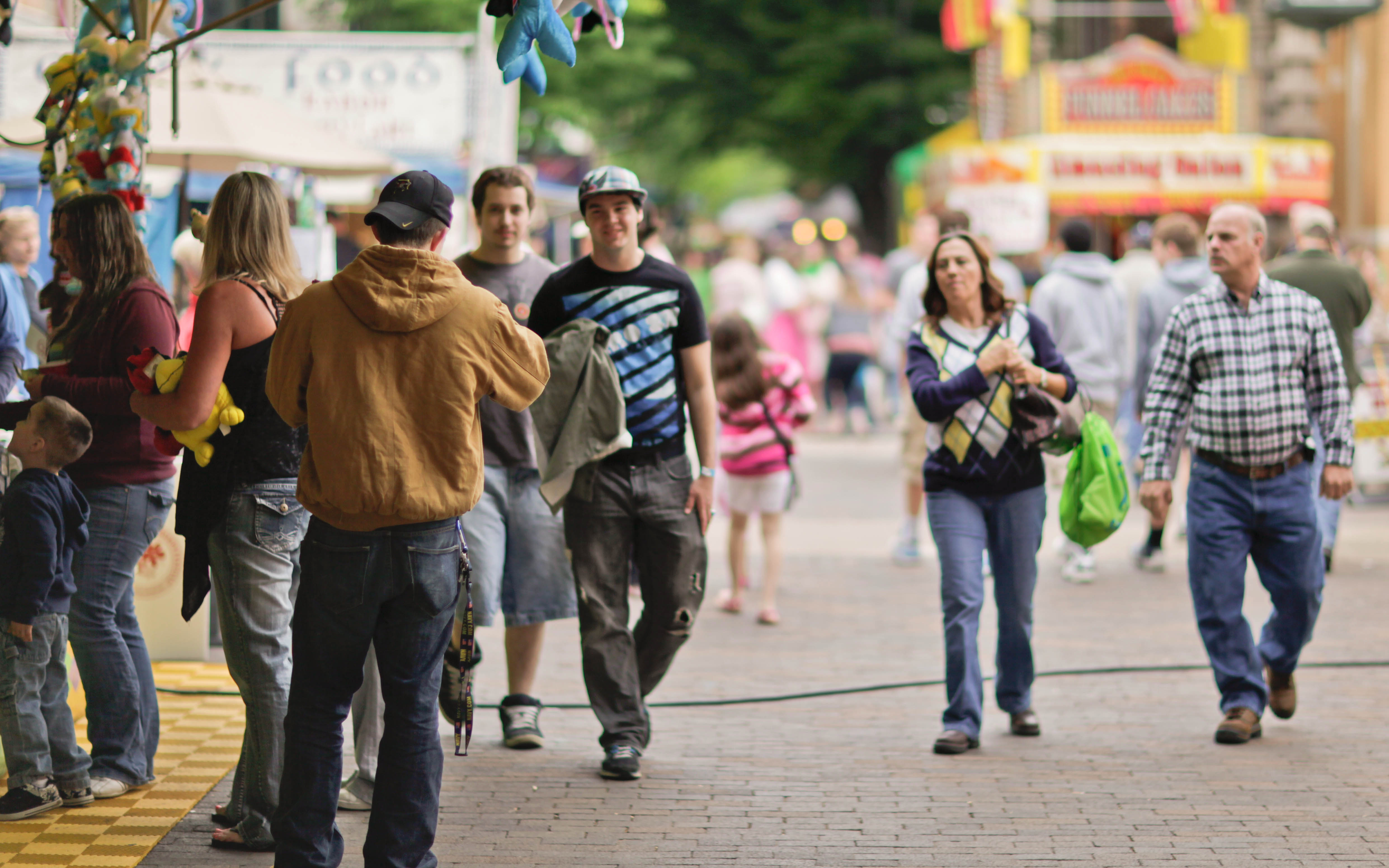 The photograph captures a lively scene at a fair, bustling with visitors enjoying the festivities. The composition includes a diverse group of people walking along the pathway, framed by bright stalls and vibrant colors, evoking a sense of joy and community. Soft, natural lighting enhances the cheerful atmosphere, inviting viewers to imagine the sounds and excitement of the fair.