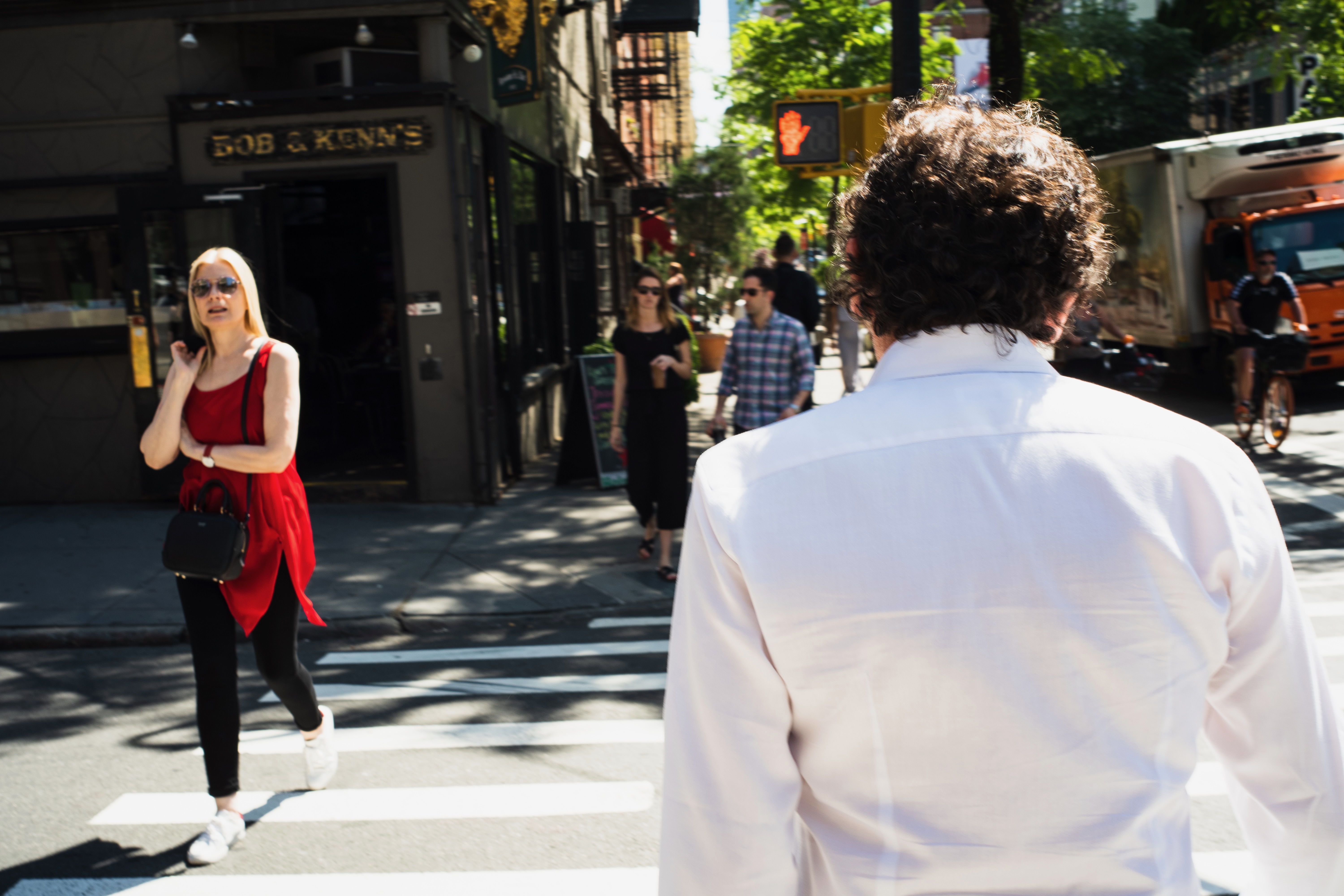 In this lively street scene, a man in a white shirt walks away from the camera, creating a sense of anonymity. A woman in a striking red dress walks towards him, and her confident stride contrasts with the casual ambiance of the urban setting. The bright sunlight casts playful shadows, enhancing the vibrant atmosphere of city life.
