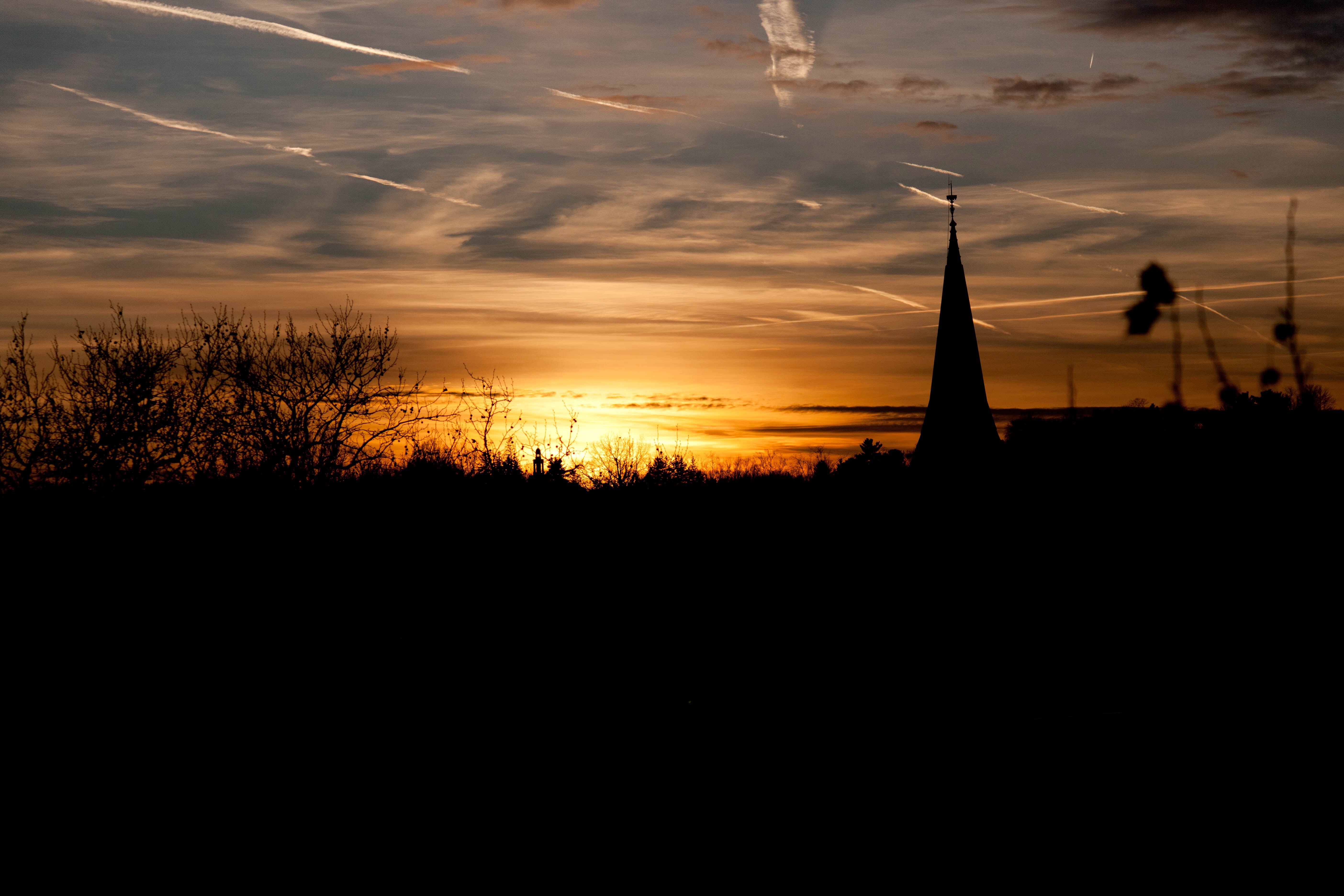 The photograph captures a serene sunset, where the rich hues of orange and gold bathe the horizon, creating a tranquil mood. Silhouetted against this vibrant canvas, a church spire emerges, adding a touch of architectural elegance to the natural beauty. Wispy clouds streak the sky, enhancing the composition’s ethereal quality as day transitions into night.