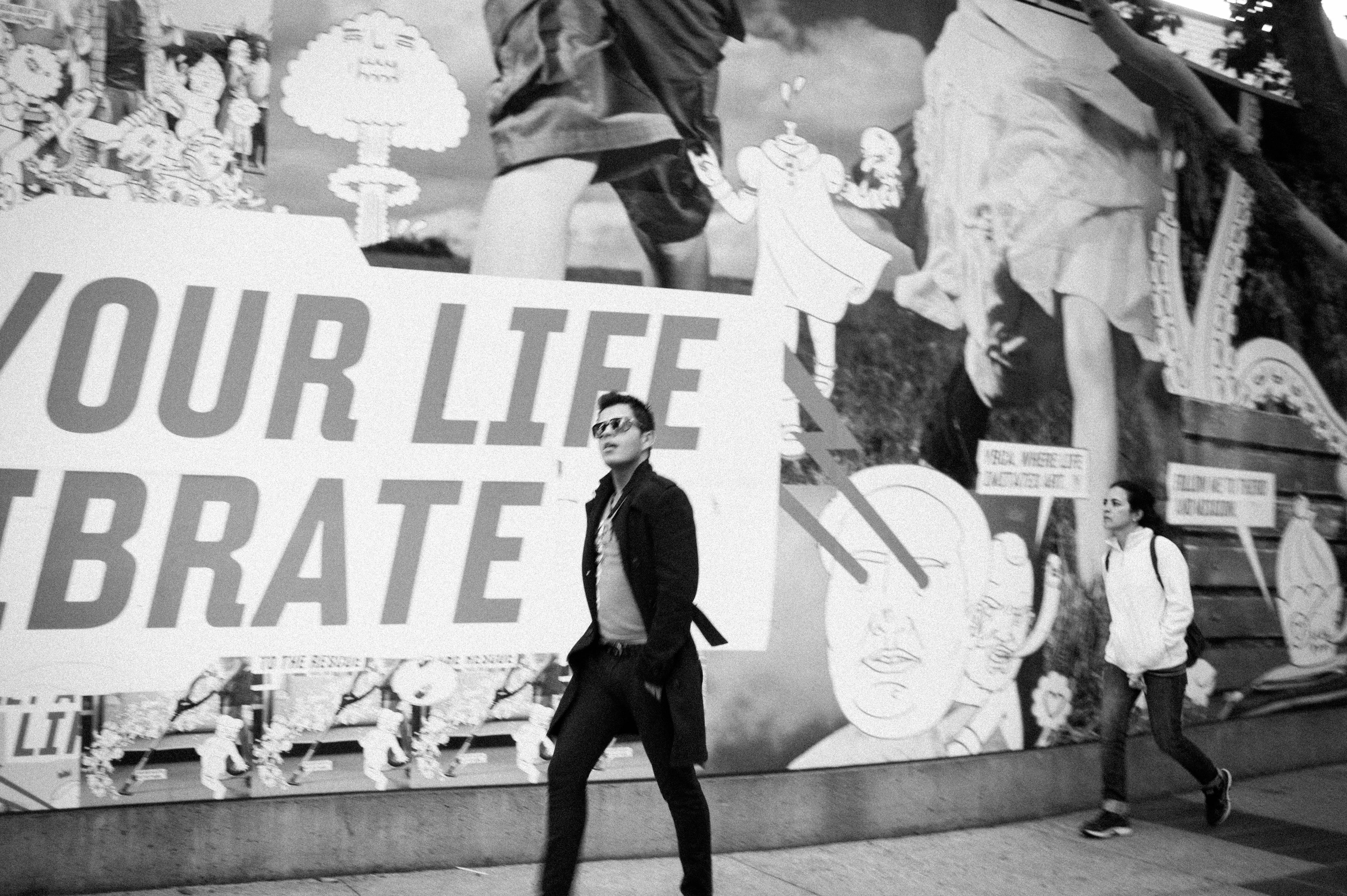 In this black-and-white photograph, a stylishly dressed man strolls past a vibrant mural, featuring a striking slogan that reads ‘YOUR LIFE CELEBRATE’. The juxtaposition of the bold text against the playful imagery creates a dynamic atmosphere, while the muted tones add a hint of nostalgia, emphasizing the contrast between individual expression and the lively backdrop of urban life.