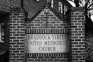 An imposing brick sign marks the entrance to Braddock Street United Methodist Church, framed by a backdrop of timeworn brick buildings. The monochromatic tones enhance a sense of solemnity and reflection, inviting contemplation amidst the cool shadows. The composition draws the viewer's eye to the church's name, evoking a feeling of permanence and spiritual resonance in a bustling urban environment.