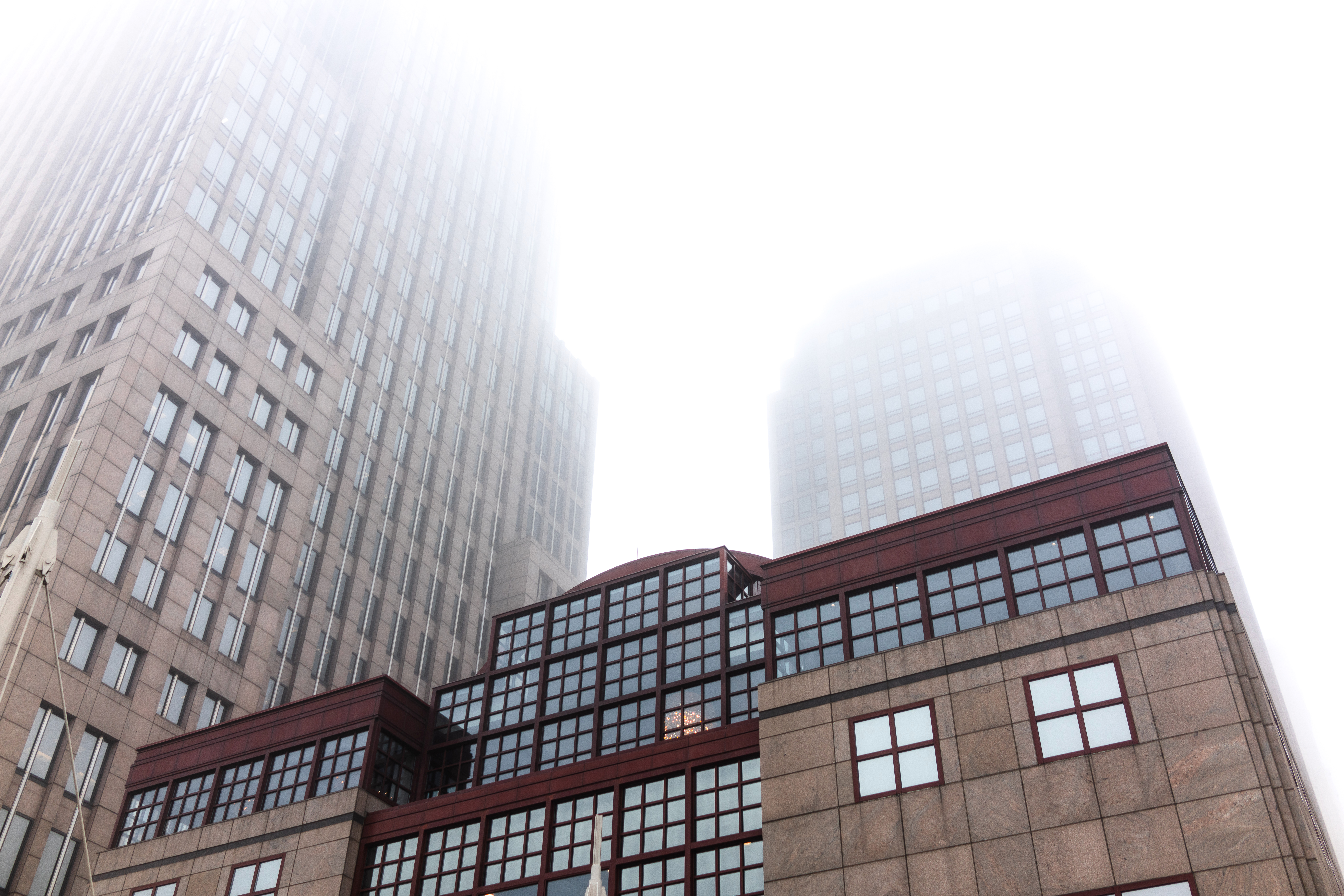 In this photograph, towering skyscrapers emerge from a thick blanket of fog, evoking a sense of mystery and depth. The muted lighting creates a soft atmosphere, while the angular composition highlights the juxtaposition of modern architecture against the obscured skyline. The subtle detailing of the building's façade contrasts with the ethereal quality of the fog, inviting contemplation on the relationship between the seen and unseen.