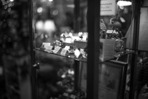 This black-and-white photograph captures a display case filled with small decorative figures, each labeled with delicate tags. The soft bokeh in the background creates an inviting, dreamlike atmosphere, while the glass reflections add a touch of complexity to the composition. The muted tones evoke a sense of nostalgia, inviting viewers to ponder the stories behind these charming little treasures.
