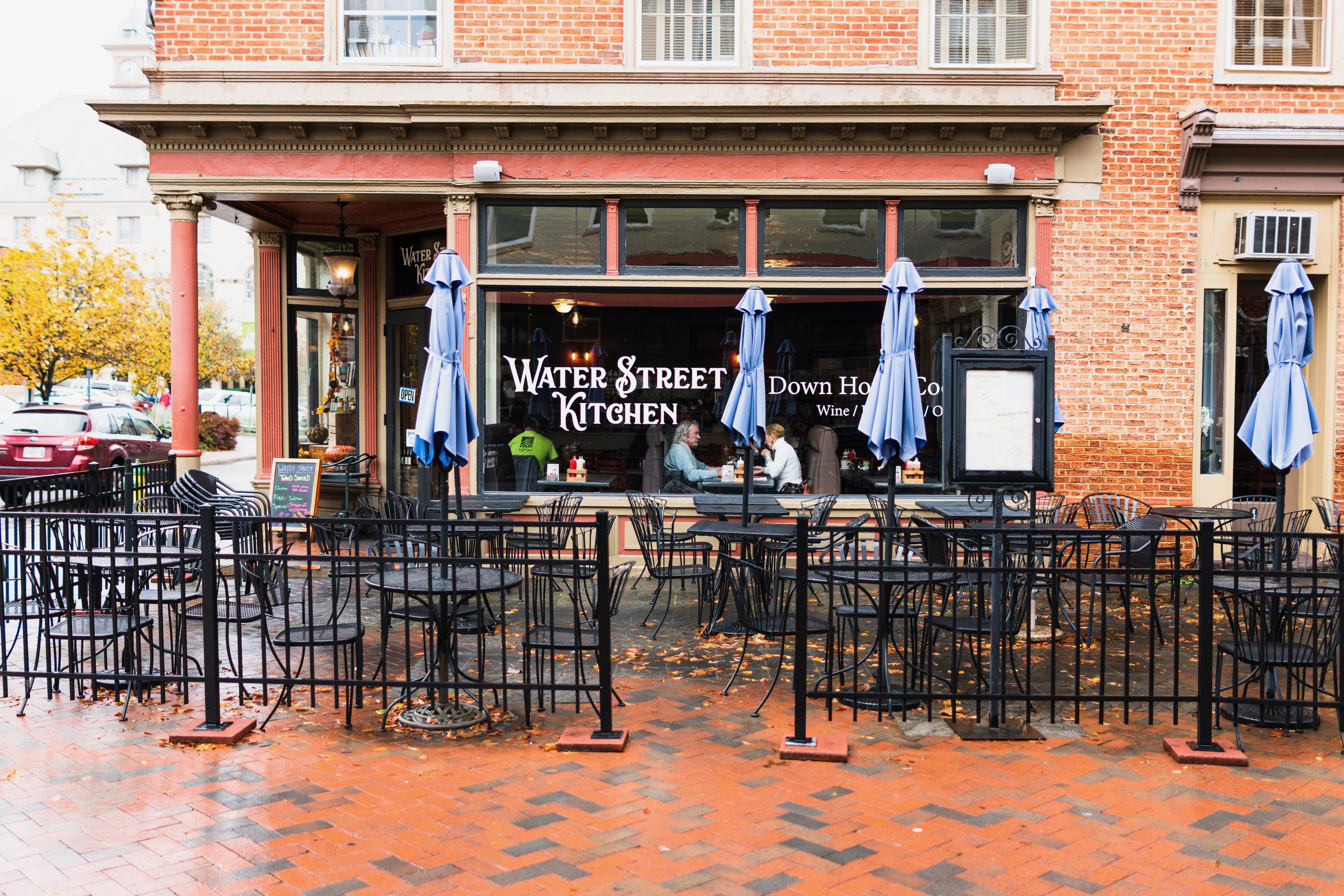 The photograph captures a charming café, Water Street Kitchen, adorned with blue umbrellas and surrounded by empty black patio chairs on a rainy day. Warm lighting glows from within, inviting a sense of comfort, while the brick facade adds rustic charm. Fallen leaves hint at the changing season, enhancing the cozy, relaxed mood of the scene.