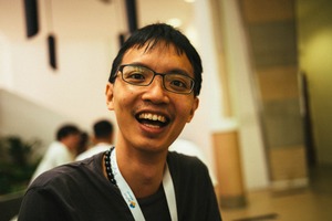 A joyful young man beams with a wide smile, exuding warmth and friendliness. The soft, diffused lighting enhances the inviting atmosphere, while the blurred background hints at a lively event. The composition captures the subject engaging with the viewer, creating a sense of intimate connection and happiness.