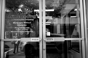 The photograph captures the glass entrance of a PrimeLending office, emblazoned with its logo and service tagline, offering a contrast between the sleek, modern architecture and the simplicity of its message. The black and white composition evokes a sense of professionalism and seriousness, while reflecting the surrounding cityscape through the glass. The subtle interplay of light and shadows enhances the mood, inviting curiosity about the lives of those who pass through this doorway into financial opportunities.