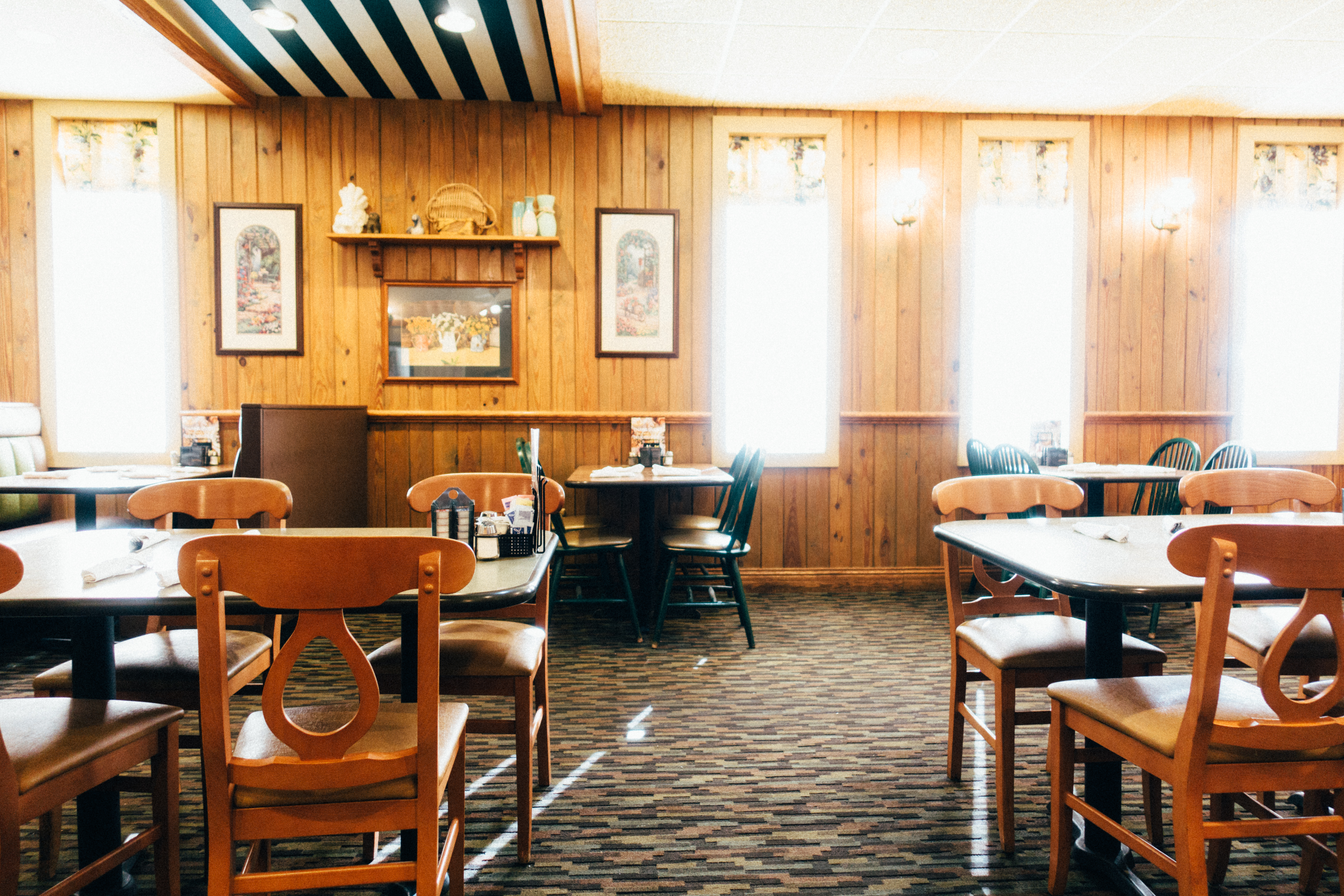 The photograph captures a cozy, rustic dining area bathed in warm, natural light streaming through large windows. Wooden paneling and vintage decor evoke a nostalgic atmosphere, while the sparse arrangement of tables and chairs suggests a quiet, inviting space perfect for intimate meals or solitary reflection. The soft shadows and earthy tones enhance the overall warmth, creating a sense of comfort and familiarity.