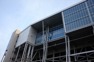 This photograph captures a sleek, modern building, emphasizing its angular lines and glass facades. The upward perspective accentuates the structural design, while the soft, diffused light contributes to a serene and contemplative mood. The interplay of light and shadow enhances the metallic textures, creating a visually striking composition.