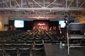 An expansive conference hall, nearly empty, with rows of black chairs stretching towards a dimly lit stage where subtle lighting hints at the anticipation of upcoming speakers. A camera sits poised on a platform, capturing the quiet energy before the event begins, while scattered attendees begin to fill the space. The atmosphere is tinged with a mix of excitement and calm, evoking the promise of knowledge and collaboration to come.