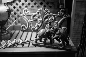 In this monochromatic photograph, a pair of elephant figurines engage in a playful tussle, capturing a moment of whimsical energy. The soft, warm light casts gentle shadows, enhancing the intricate details of the sculpture while contrasting against a richly textured backdrop. An air of nostalgia pervades the scene, inviting reflection and warmth amidst the stillness.
