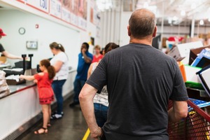 The photograph captures a bustling store scene, focusing on a man with his back turned, emphasizing the busy atmosphere. Bright overhead lighting highlights the variety of customers, each engaged in their own shopping journey, while a vivid cart brimming with items hints at the day's purchases. The composition conveys a sense of community and everyday life in a retail environment.