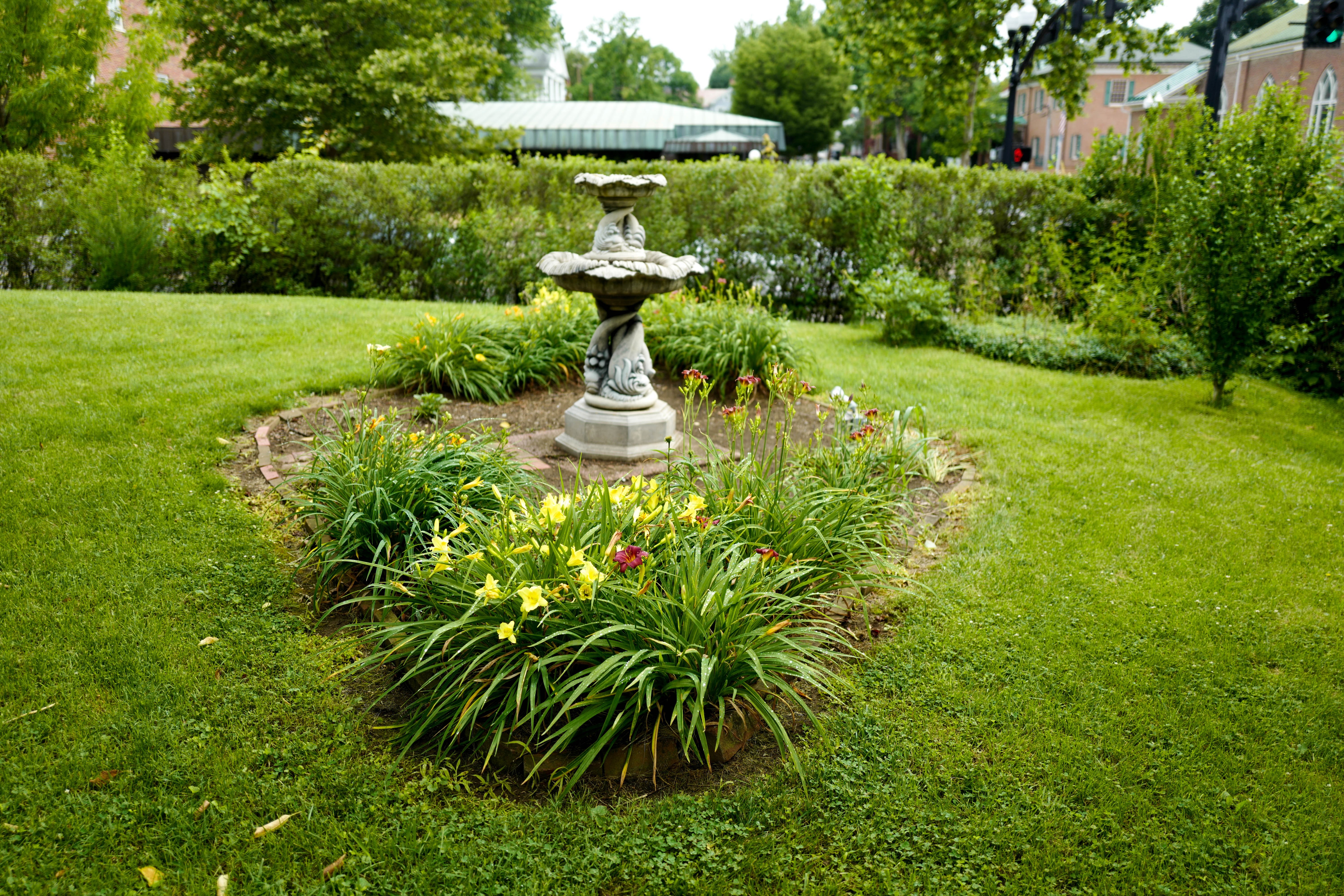 A charming stone fountain stands at the center of a lush garden, surrounded by vibrant yellow and pink flowers. The soft, diffused light captures the greenery and adds a tranquil ambiance, inviting moments of reflection. The composition emphasizes the harmony between nature and architecture, creating a peaceful escape.