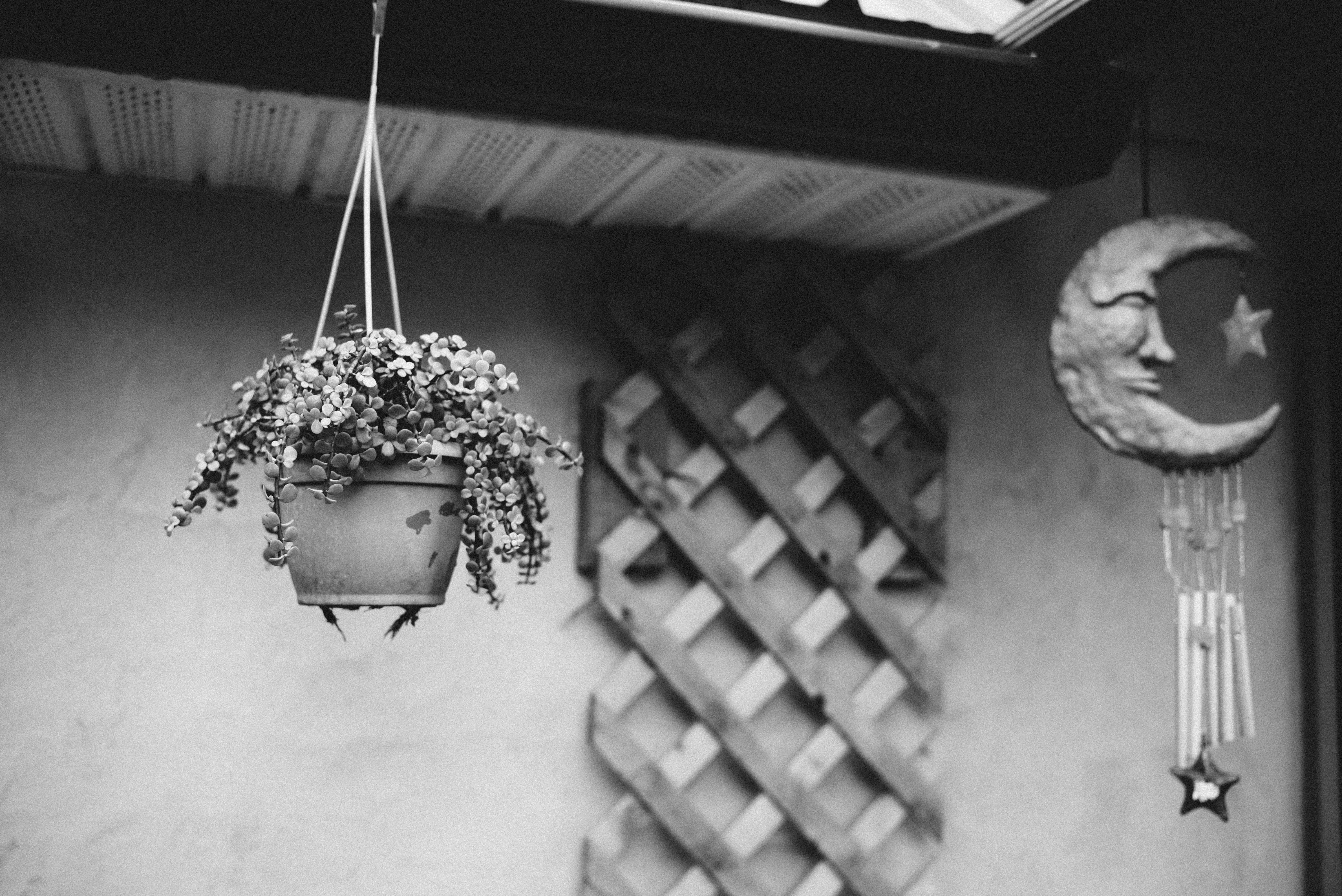 In this serene black-and-white photograph, a hanging pot brims with delicate foliage, drawing the gaze upward against a textured backdrop. Soft lighting bathes the scene, casting gentle shadows that enhance the tranquil mood, while the moon and star motif to the right add a whimsical touch. The composition reflects a subtle harmony between nature and imaginative decor, inviting quiet contemplation.
