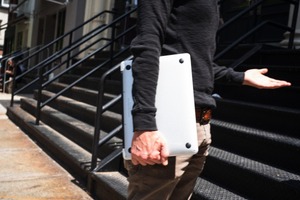 A figure strides confidently down a sunlit urban staircase, holding a laptop close to their body. The strong contrast between shadows and light creates a dynamic mood, suggesting purposeful movement amidst a bustling environment. The composition highlights the individual’s relaxed yet focused demeanor, emphasizing a blend of productivity and casual city life.
