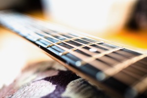 The photograph captures a close-up view of a guitar neck, emphasizing the smoothness of the fretboard and the delicate strings. Soft, natural light bathes the scene, creating a warm and inviting atmosphere that evokes a sense of calm and introspection. The gentle focus on the strings leads the viewer's eye through the composition, suggesting a moment of quiet musicality.