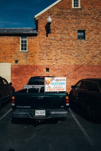 This photograph captures a sunlit scene of a parked truck displaying a vibrant sign for a local guitar shop. The warm tones of the brick wall create a nostalgic atmosphere, while the clear blue sky adds a refreshing contrast, evoking a sense of community and creativity in this urban setting.