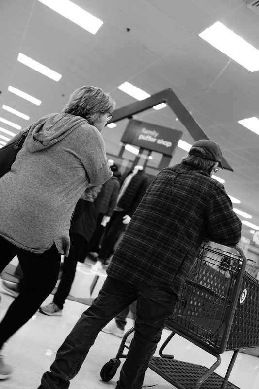 In this black-and-white photograph, two shoppers navigate through a bustling retail space, each carrying the weight of their day's errands. The composition creates a sense of movement, with the shoppers in profile, embodying a collective purpose amidst a sea of muted colors and overhead lighting. The atmosphere is filled with a blend of routine urgency and quiet camaraderie, encapsulating the essence of everyday life.