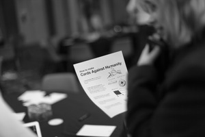 In a black and white setting, a woman focuses intently on a printed guide, detailing how to make 'Cards Against Humanity.' The soft lighting casts a contemplative mood, emphasizing the playful and somewhat irreverent subject matter of the document against the blurred background of an empty room.