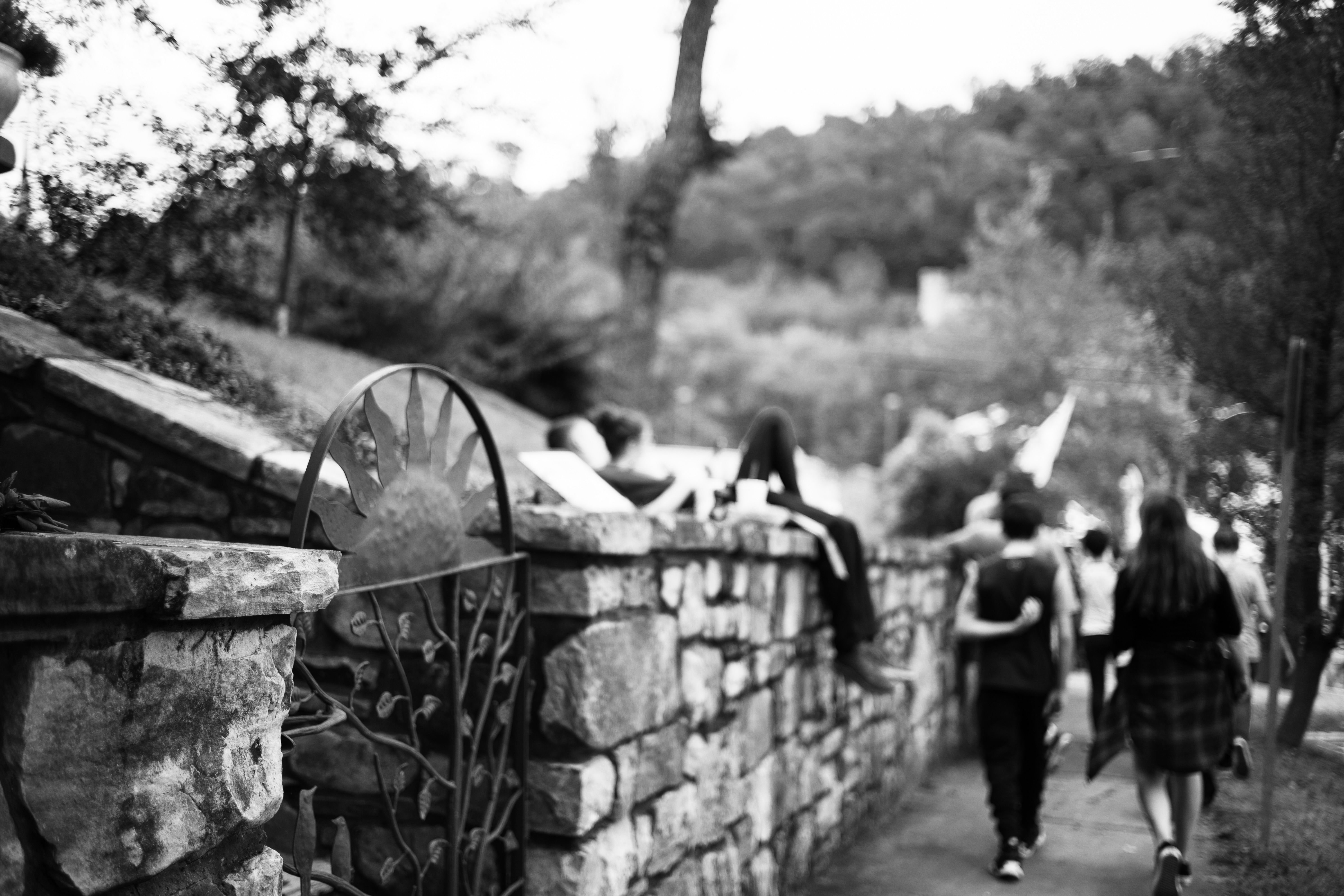 In this candid black-and-white shot, a group of people strolls along a stone pathway, creating a sense of everyday life and camaraderie. The blurred foreground draws attention to a solitary figure relaxing on the wall, exuding a peaceful, laid-back mood. Soft light filters through the trees, casting gentle shadows that further enhance the tranquil atmosphere.