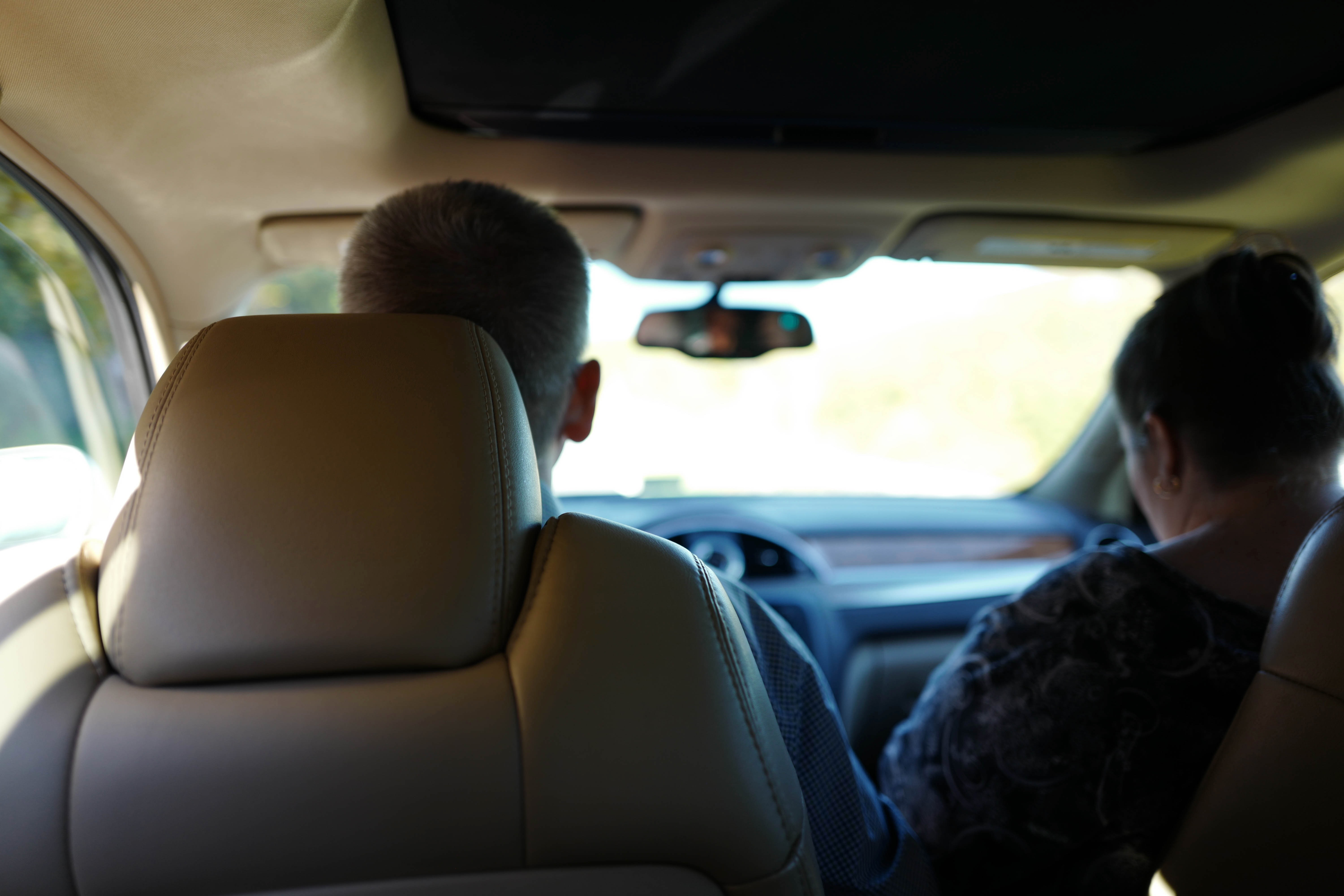 This photograph captures a moment inside a vehicle, focusing on the backs of two passengers. Soft, natural light filters through the windows, creating a serene and intimate atmosphere as they embark on their journey together. The composition emphasizes their connection while leaving their identities shrouded in mystery, inviting contemplation about where they might be headed.