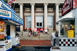 The photograph captures a lively scene outside a grand building, where a diverse group of people sits on the steps, enjoying a warm day. The bright food stalls on either side lend a cheerful atmosphere, while the warm lighting highlights the relaxed mood of the gathering. The composition creates a sense of community and shared enjoyment, drawing the viewer into an everyday moment filled with simple pleasures.