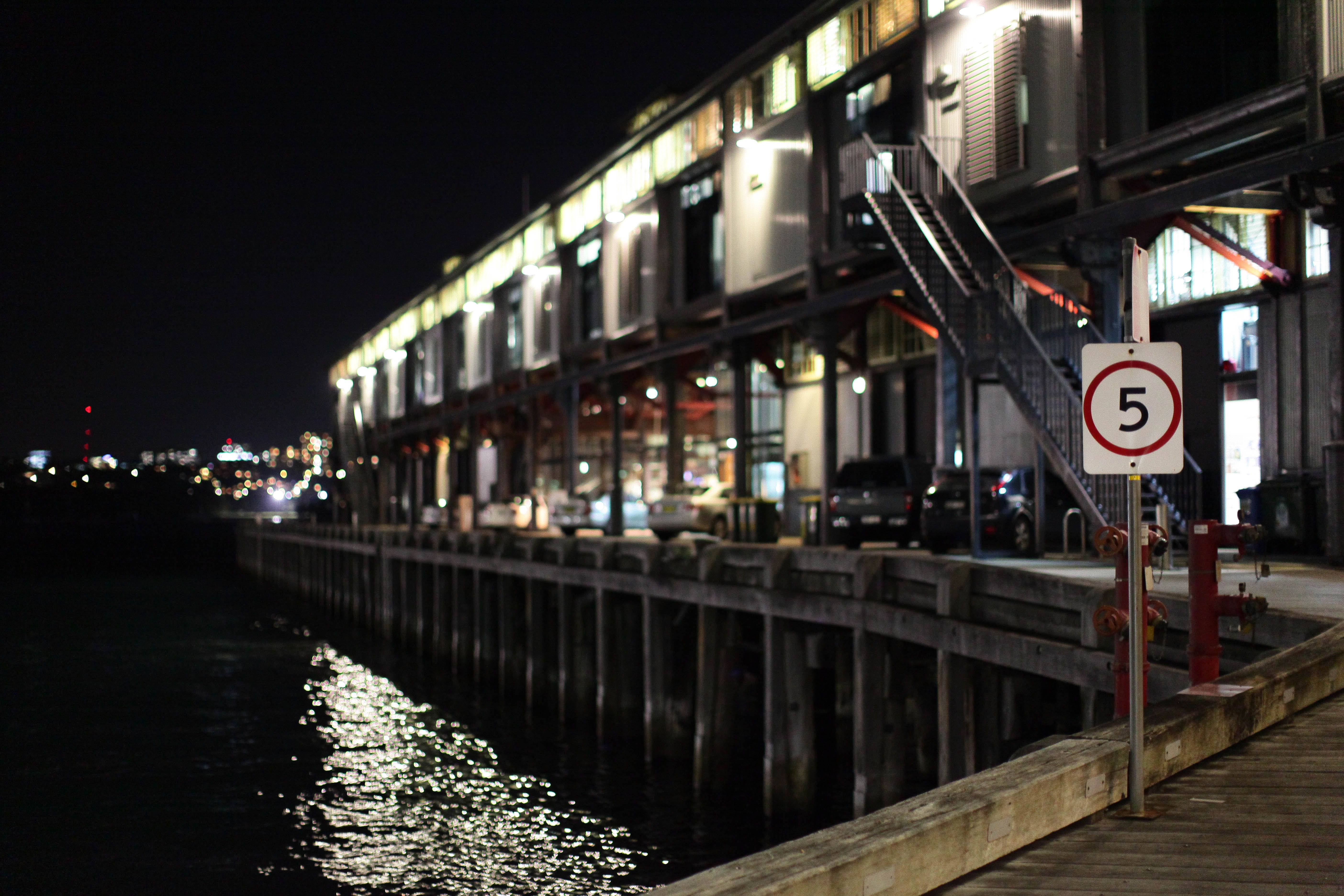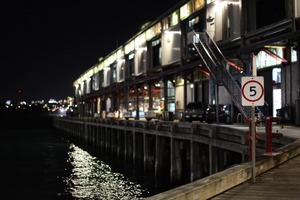 This photograph captures a serene night at the pier, where illuminated windows of a building cast a warm glow against the dark water below. The sharp contrast between the vibrant lighting and the deep shadows creates a tranquil yet slightly mysterious atmosphere. The composition draws the viewer's eye along the wooden structure, leading to the distant city lights that twinkle on the horizon.