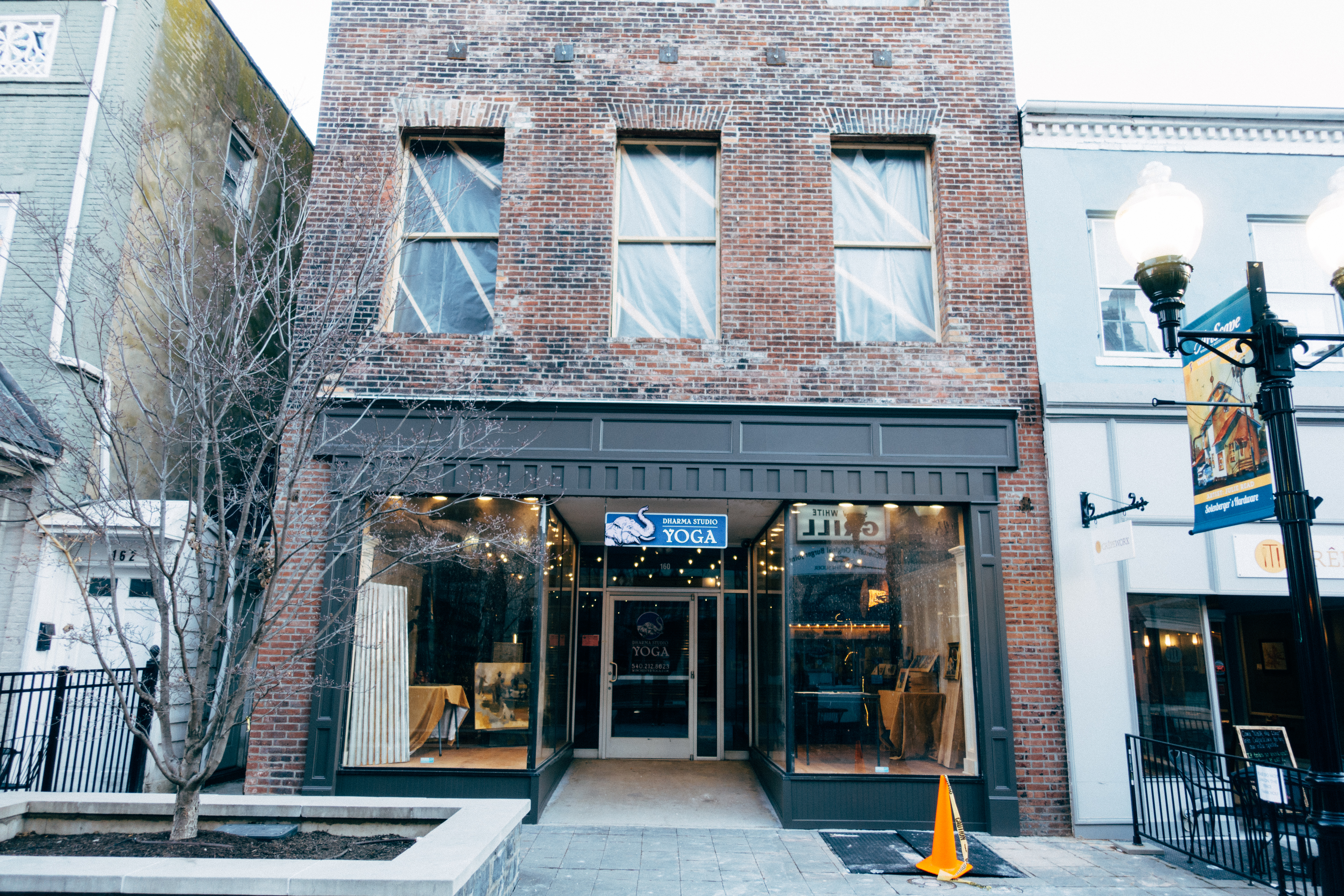 This photograph captures a serene yoga studio nestled in a historic brick building, emanating a calm and inviting aura. The muted, early morning light casts gentle shadows, enhancing the cozy atmosphere while the bare tree in front suggests the quiet of winter. The composition draws the eye to the studio's welcoming entrance, creating a sense of peace in the urban setting.