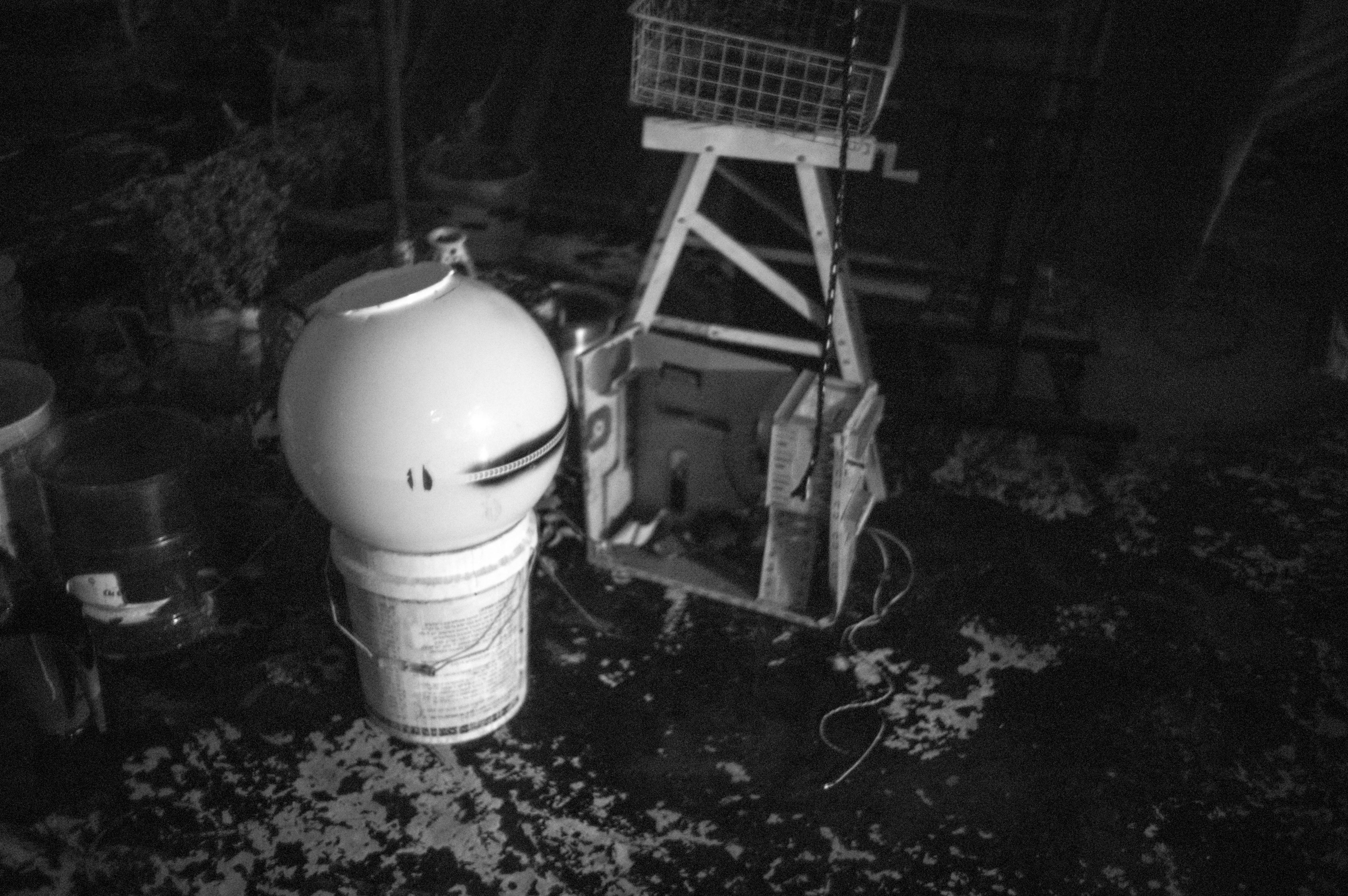 In a dimly lit space, a cracked spherical object sits atop a paint bucket, surrounded by a chaotic arrangement of tools and containers. The stark contrast of light and shadow creates an eerie, contemplative atmosphere, evoking a sense of abandonment and nostalgia. The composition draws the eye to the broken sphere, symbolizing fragility amidst the clutter.