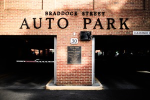 The photograph captures the entrance to a parking garage, framed by the imposing brick wall and bold signage of 'Braddock Street AUTO PARK.' The warm lighting casts a golden hue, contrasting with the shadows that hint at the hidden depths of the structure, evoking a sense of anticipation and urban solitude.