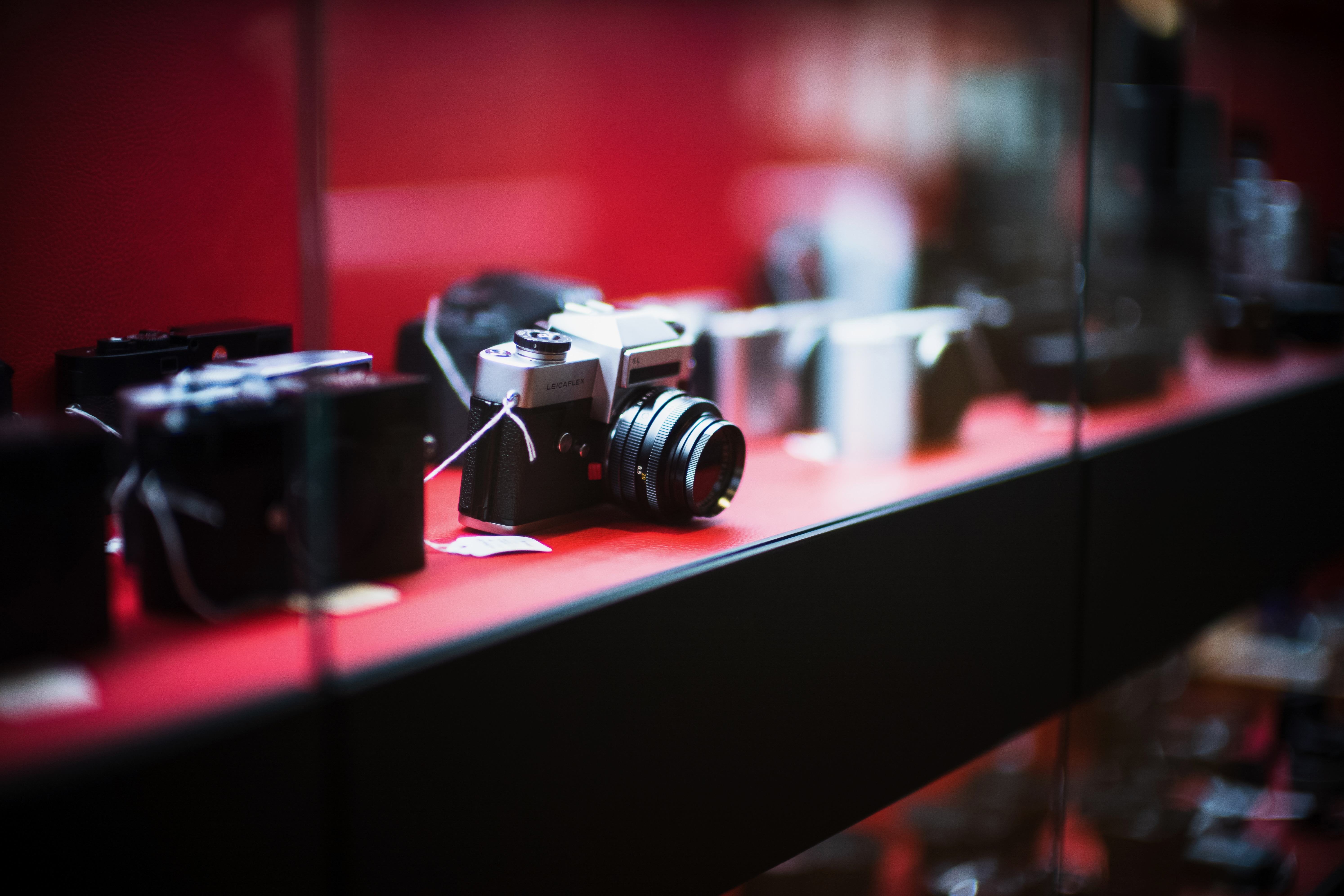 This photograph showcases a vintage camera prominently displayed behind glass, its polished surface gleaming under warm, soft lighting. The rich red backdrop creates a striking contrast against the assorted black and silver cameras, evoking a sense of nostalgia and the artistry of photography. The selective focus draws attention to the featured camera, inviting viewers to appreciate its design and history amidst the surrounding artifacts.