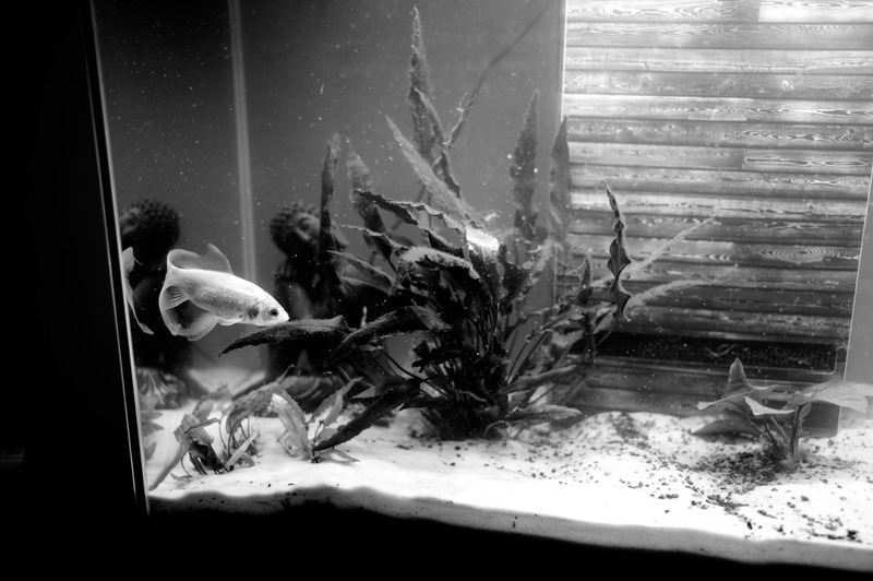 In a serene underwater world, a lone fish glides gracefully through the softly illuminated water, surrounded by lush aquatic plants. The monochromatic tones amplify the mood of tranquility and introspection, while the subtle play of light and shadow creates a sense of depth. The composition invites the viewer to pause and reflect on the peaceful simplicity of this aquatic environment.