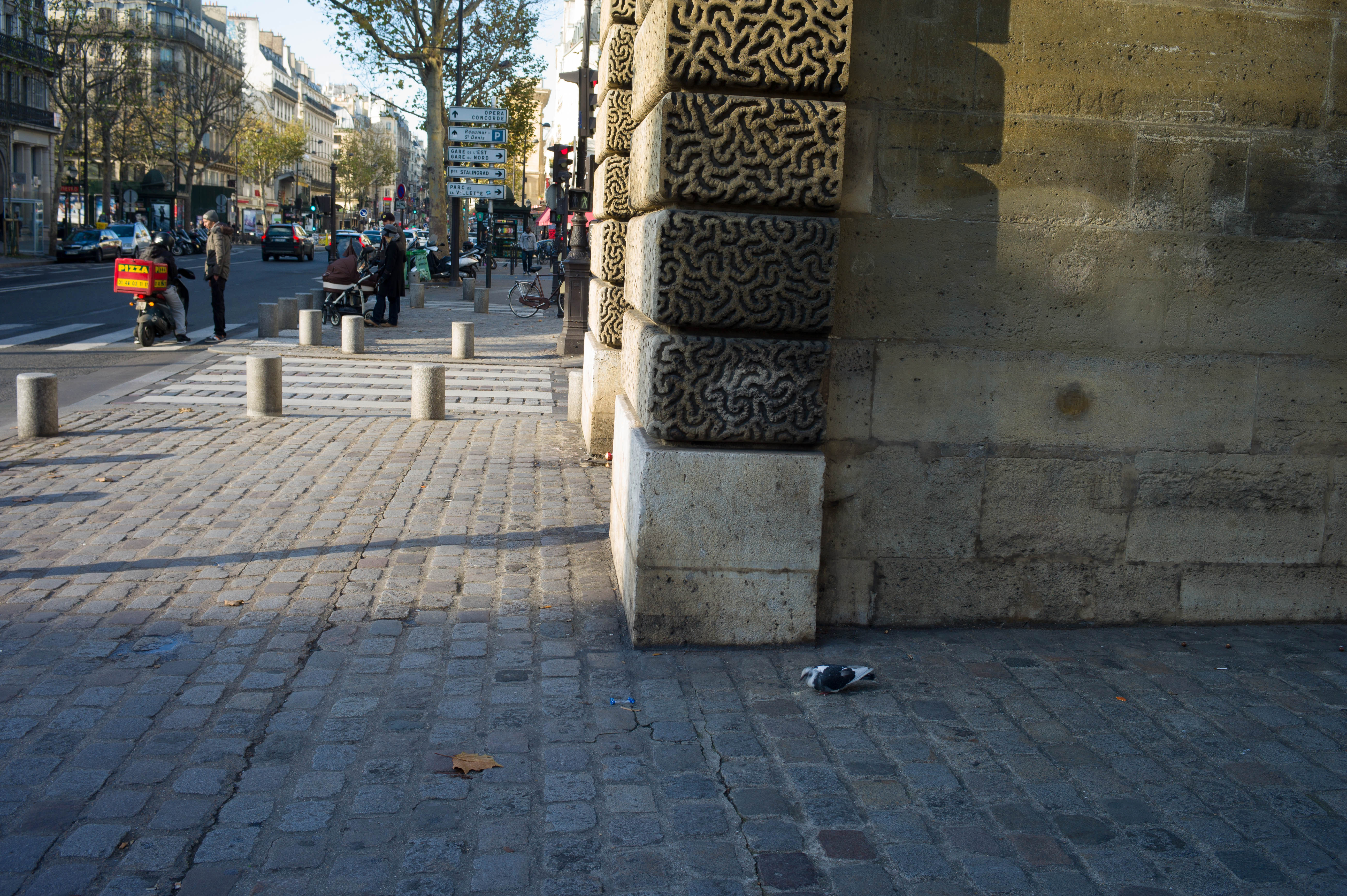The photograph depicts a quiet Parisian street corner, where a pigeon rests against the cobblestones. The warm lighting highlights the intricate patterns of the stone column, contrasting with the stillness of the scene. A sense of solitude pervades the composition, with few figures in the distance, evoking a tranquil yet vibrant urban atmosphere.