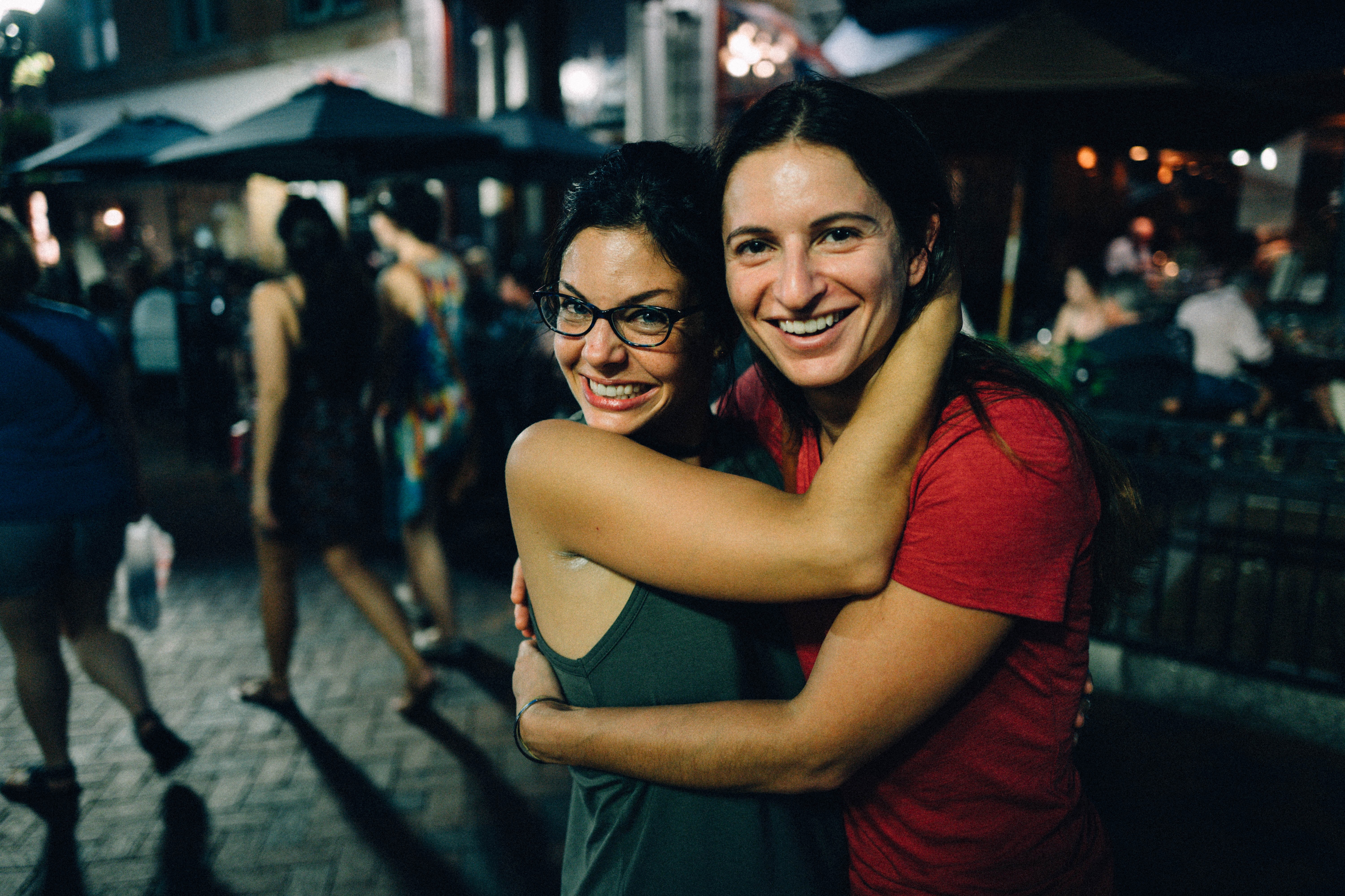 In a lively evening setting, two women share a joyful embrace, exuding warmth and friendship. The soft, ambient lighting highlights their smiles, creating an intimate atmosphere amidst the bustling background of diners and casual strollers. Their carefree expressions resonate with a sense of camaraderie and celebration, capturing a moment of pure happiness.