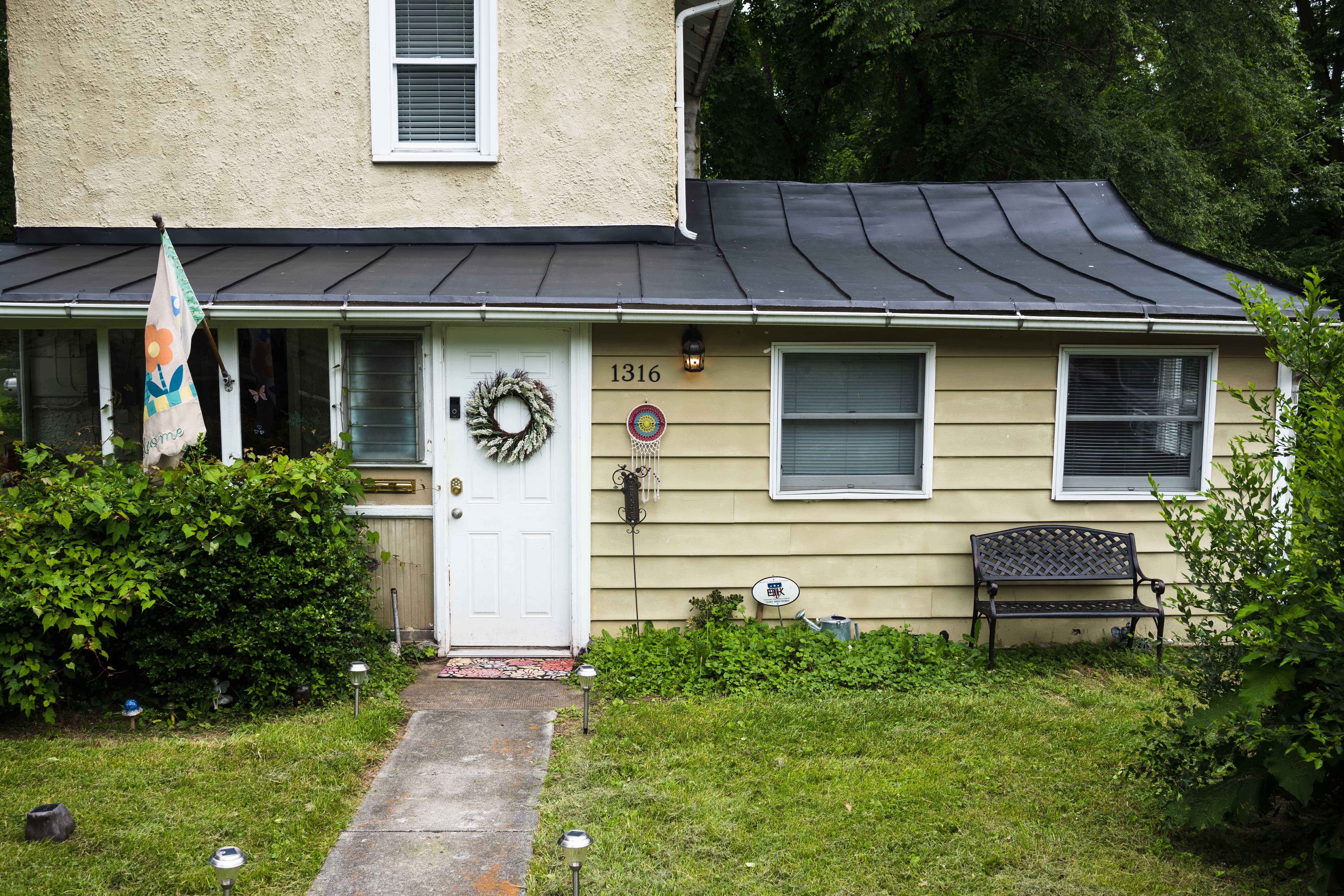This photograph captures the inviting facade of a modest suburban home, with a white door adorned by a wreath and a flag gently fluttering in the breeze. The lush greenery surrounding the entrance adds a warm, welcoming touch, while the soft daylight illuminates the scene, creating a serene and peaceful atmosphere. The simple composition draws the viewer's eye to the details, evoking a sense of comfort and homey charm.