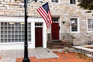A charming streetscape captures the essence of small-town America with an American flag proudly waving beside a historic stone building. The warm tones of the brick pavement contrast with the cool, muted colors of the structure, evoking a sense of nostalgia and community. Soft, natural light enhances the inviting atmosphere, making this scene both tranquil and patriotic.