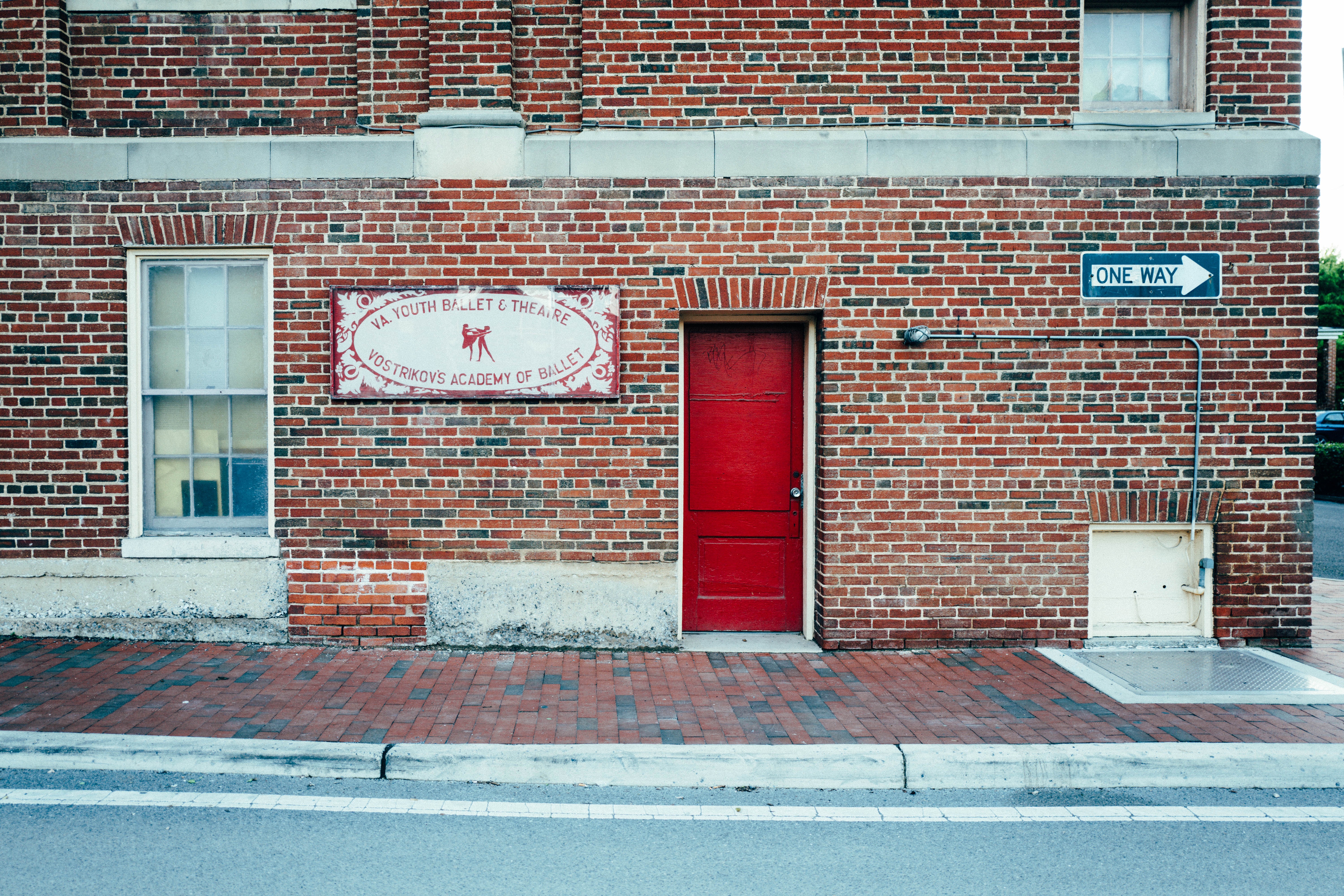 This photograph captures a charming red doorway nestled within a weathered brick façade, embellished with a vintage sign for a ballet academy. The soft midday light highlights the textures of the bricks and the door's vibrant hue, evoking a sense of creative refuge. A one-way sign subtly directs attention beyond, hinting at stories waiting to unfold in this artistic corner of the city.
